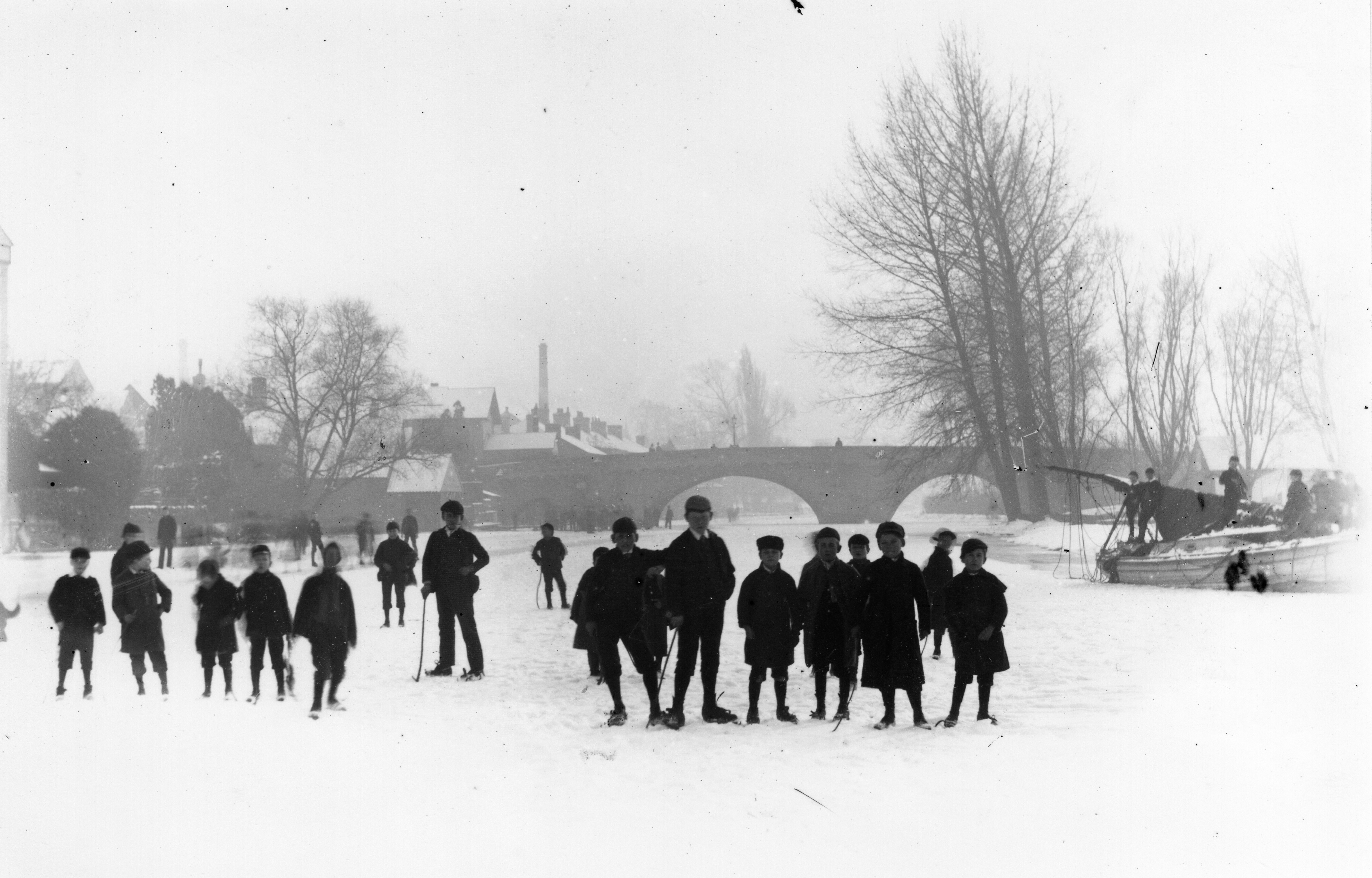 På elva Ouse i Huntingdon var det en stor skøytematch nyttårsaften torsdag den 31. desember om Ouse-mesterskapet. Mange av samtidas beste løpere var med og noen av fortidas, så det var nok litt av et høydepunkt. Det var ikke ideelle forhold med sterk kulde og tjukk tåke, men likevel var det mer enn 5000 tilskuere på elveisen. Enda flere samla seg på bruene, på borgtårna, elvebreddene og andre steder hvor de kunne følge med på løpet. Herolden fikk beskjed om å advare folk mot å stå for tett på elveisen. Men til ingen nytte, de sto så tett de kunne til det hørtes et djupt brak som fikk dem til å spre seg igjen. Dette skjedde flere ganger. Men isen var for tjukk til å sprekke opp og slippe opp vann. Bildet er fra Cambridge Community Archives, det er fra St. Neots i stedet for Huntingdon og fra 1891 i stedet for 1874, men elva er den samme.